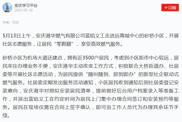 安慶:服務(wù)隨叫隨到 業(yè)務(wù)即到即辦 打造燃氣社區(qū)服務(wù)新模式(轉(zhuǎn)載于學習強國)