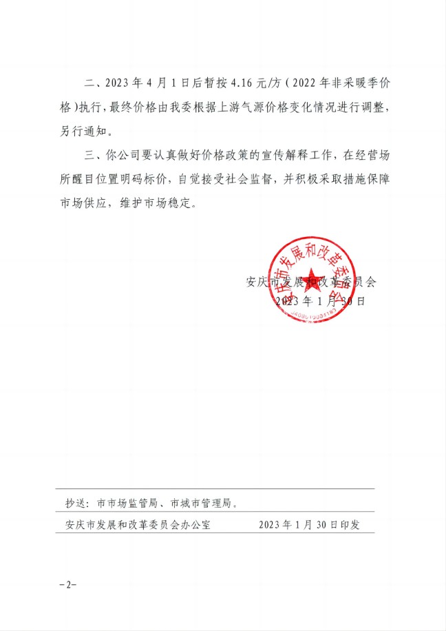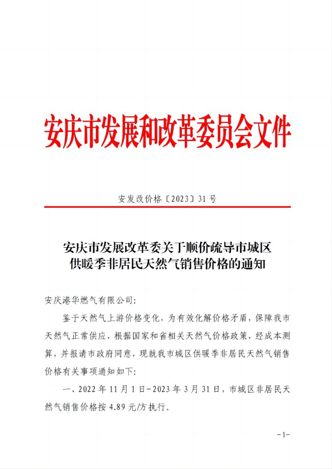 安慶市發(fā)展改革委關(guān)于順價(jià)疏導(dǎo)市城區(qū)供暖季非居民天然氣銷售(2023)價(jià)格的通知-安發(fā)改價(jià)格【2023】31號(hào)