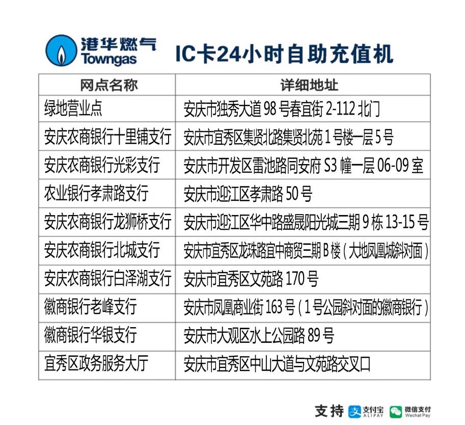 目前我公司支持交通銀行、徽商銀行、郵政儲蓄銀行、工商銀行、農(nóng)業(yè)銀行和浦發(fā)銀行的網(wǎng)上銀行和手機銀行,以及移動“中國移動”、電信“翼支付”、我公司微信公眾號和在“微信”-“生活繳費”、“支付寶”-“生活繳費”中查詢?nèi)細(xì)赓M并繳納欠費或預(yù)存氣費。