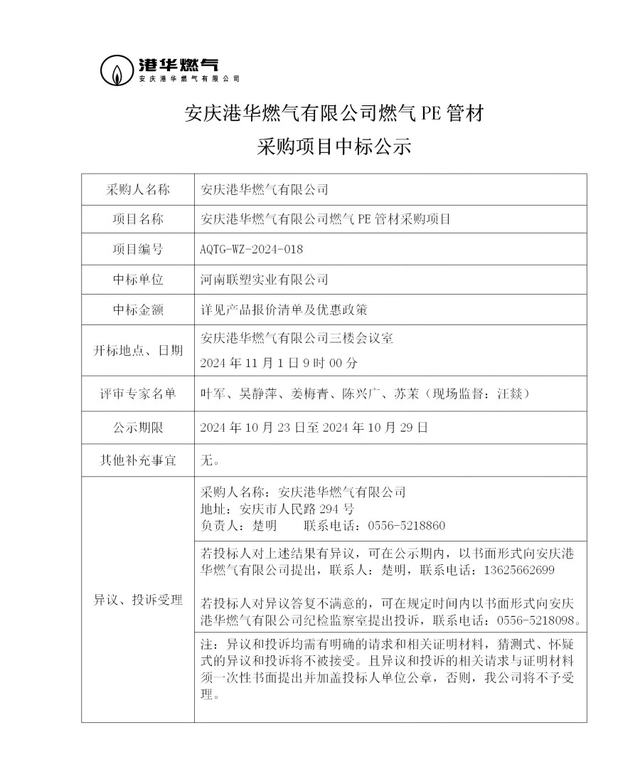 安慶港華燃?xì)庥邢薰救細(xì)釶E管材采購(gòu)項(xiàng)目中標(biāo)公示