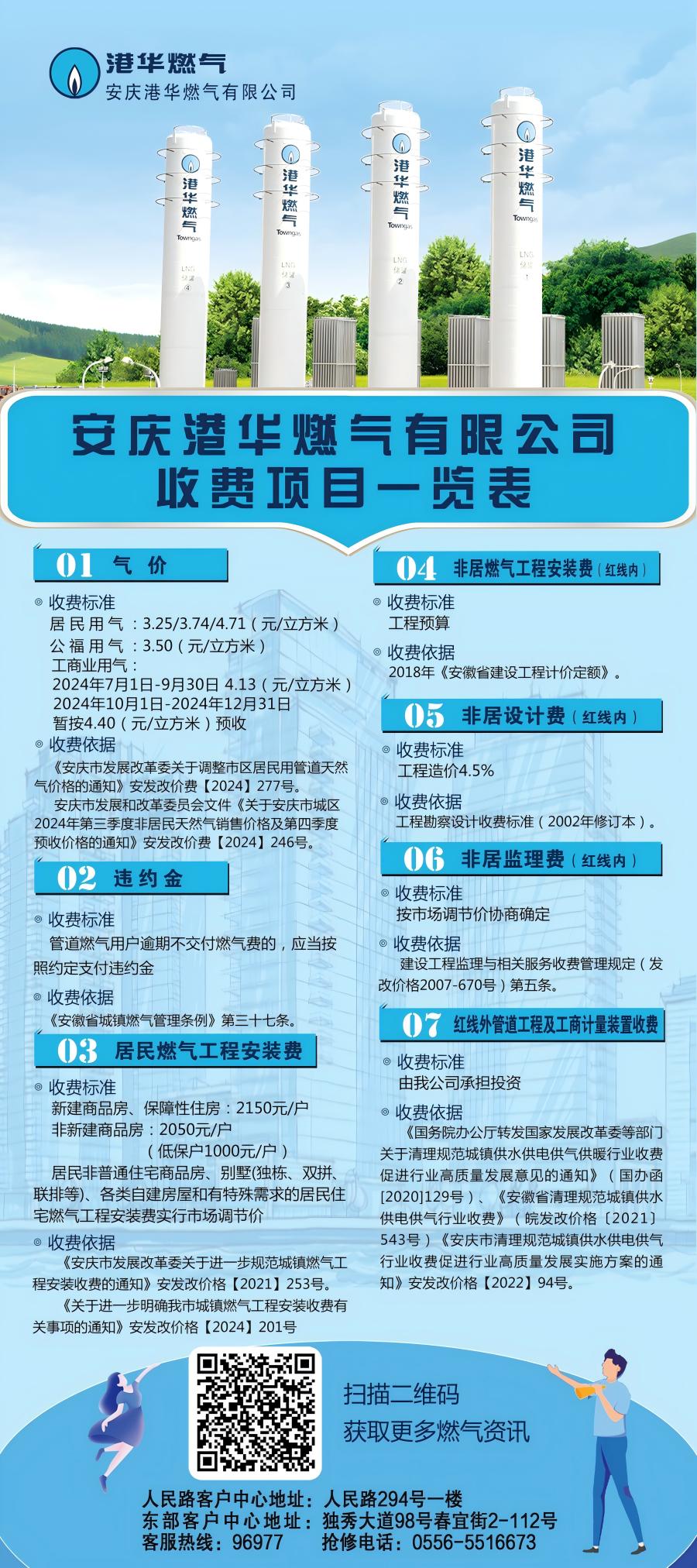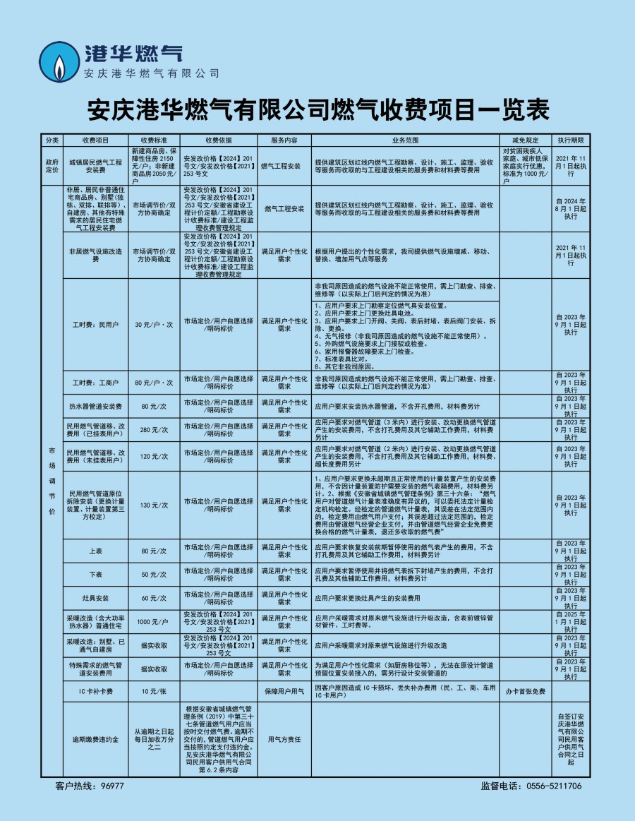 安慶港華燃氣有限公司收費項目一覽表(2024)