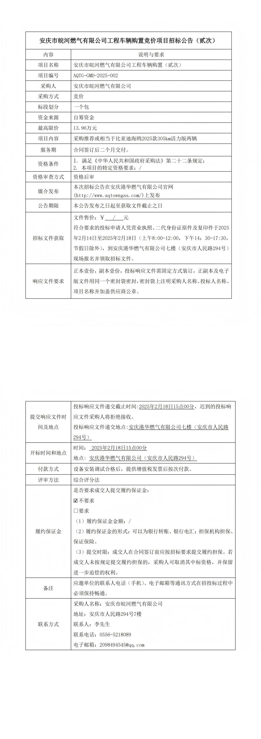 安慶市皖河燃?xì)庥邢薰竟こ誊囕v購置競價項(xiàng)目招標(biāo)公告(貳次)