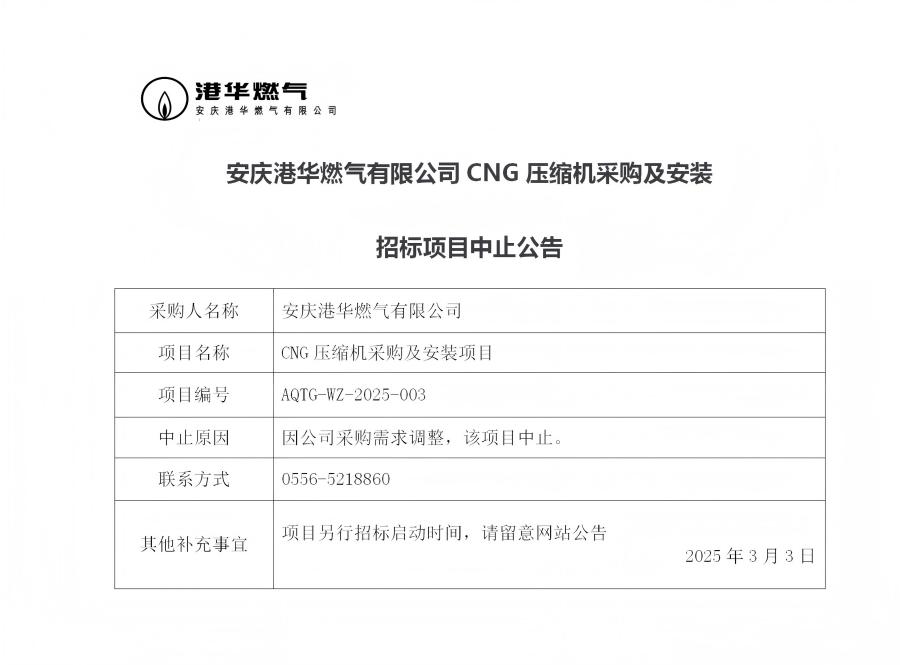 安慶港華燃氣有限公司CNG壓縮機采購及安裝招標項目中止公告