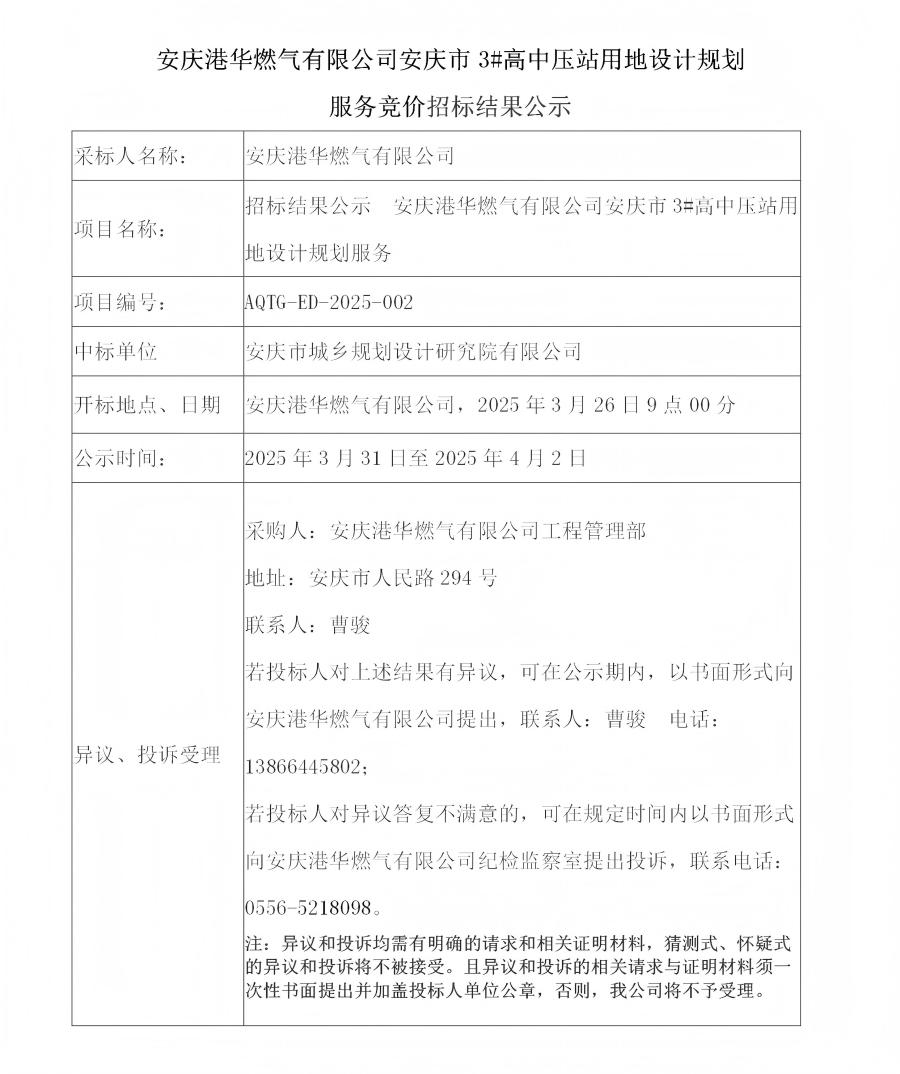 安慶港華燃氣有限公司安慶市3#高中壓站用地設計規(guī)劃服務競價招標結果公示