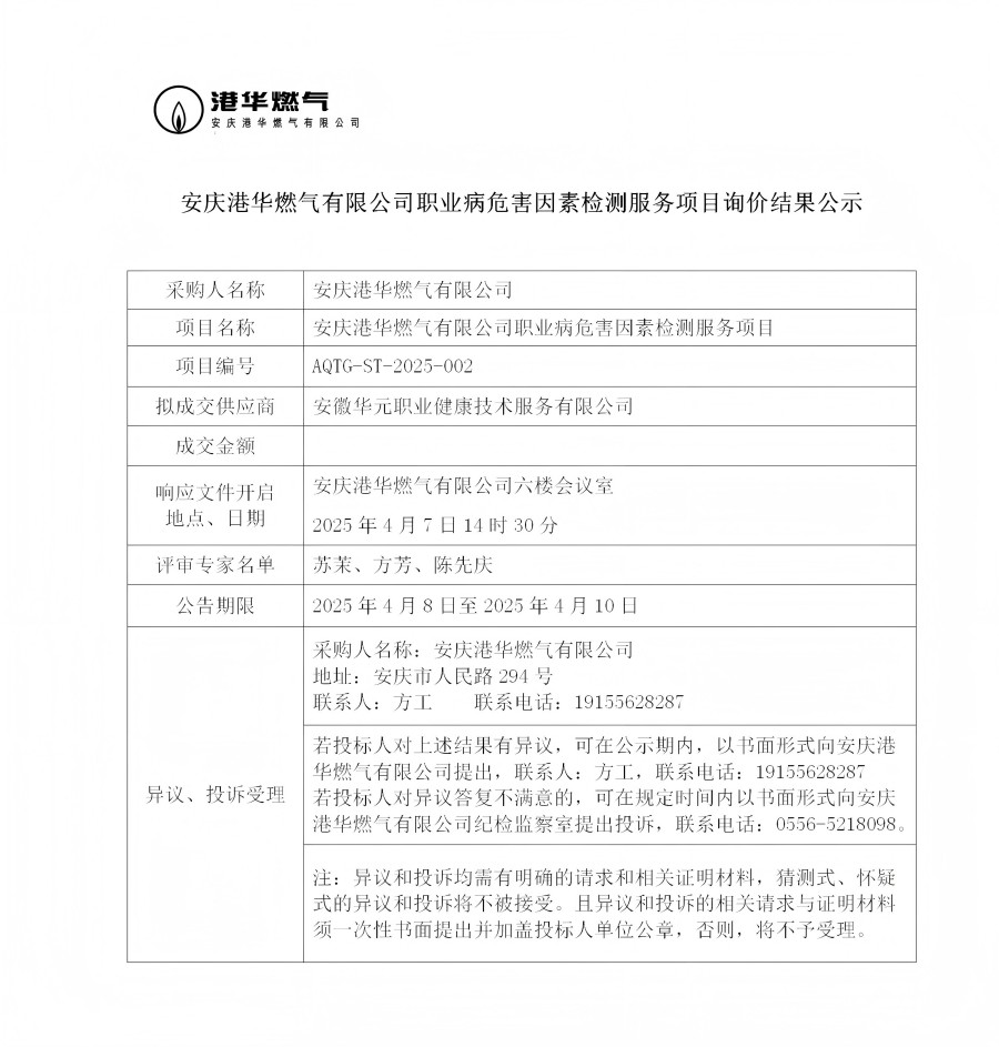 安慶港華燃氣有限公司職業(yè)病危害因素檢測服務(wù)項目詢價結(jié)果公示