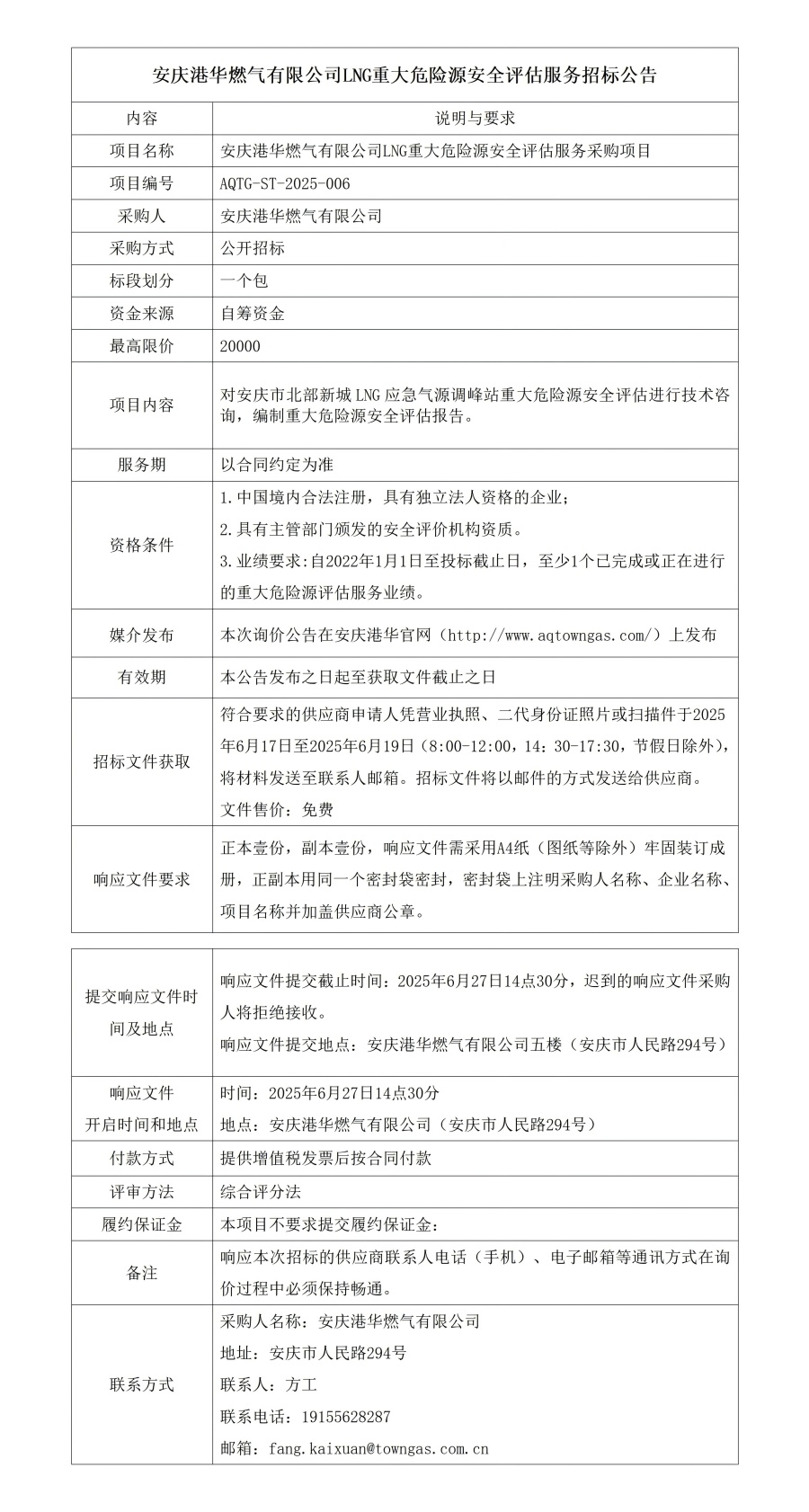 安慶港華燃氣有限公司LNG重大危險源安全評估服務招標公告