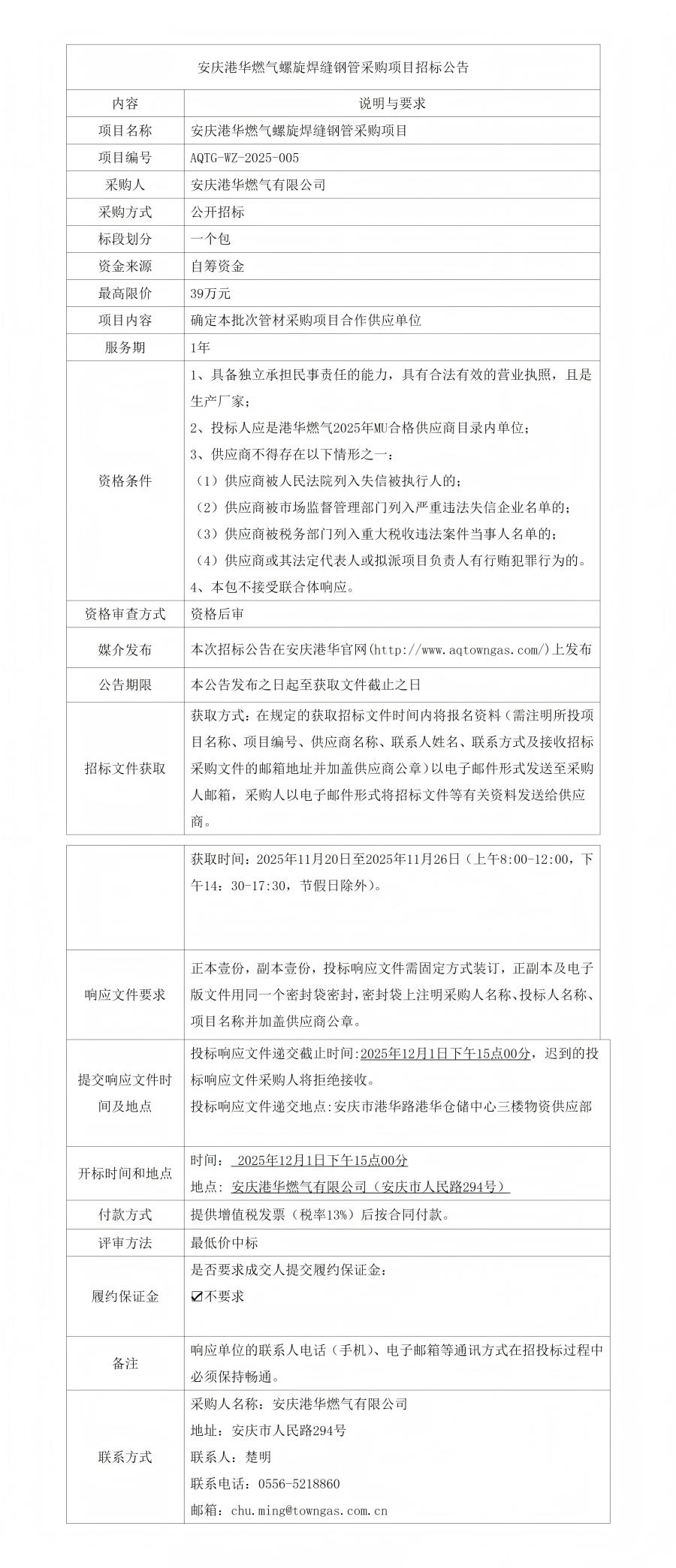 安慶港華燃?xì)饴菪缚p鋼管采購項(xiàng)目招標(biāo)公告